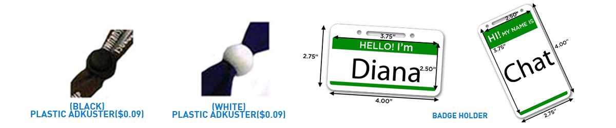 Our Company offers 11 types of lanyards attachments of which 6 of them are free! Safety Break-Away is the standard free options for your customized lanyards, other free options are Key Ring, Shivel J-Hook, Bulldog Clip, Plastic J-Hook and Lobster Claw. We also offer plastic and metal beads, crystal clear badge holder, carabiner and cellphone loop for additional beauty of your lanyards.